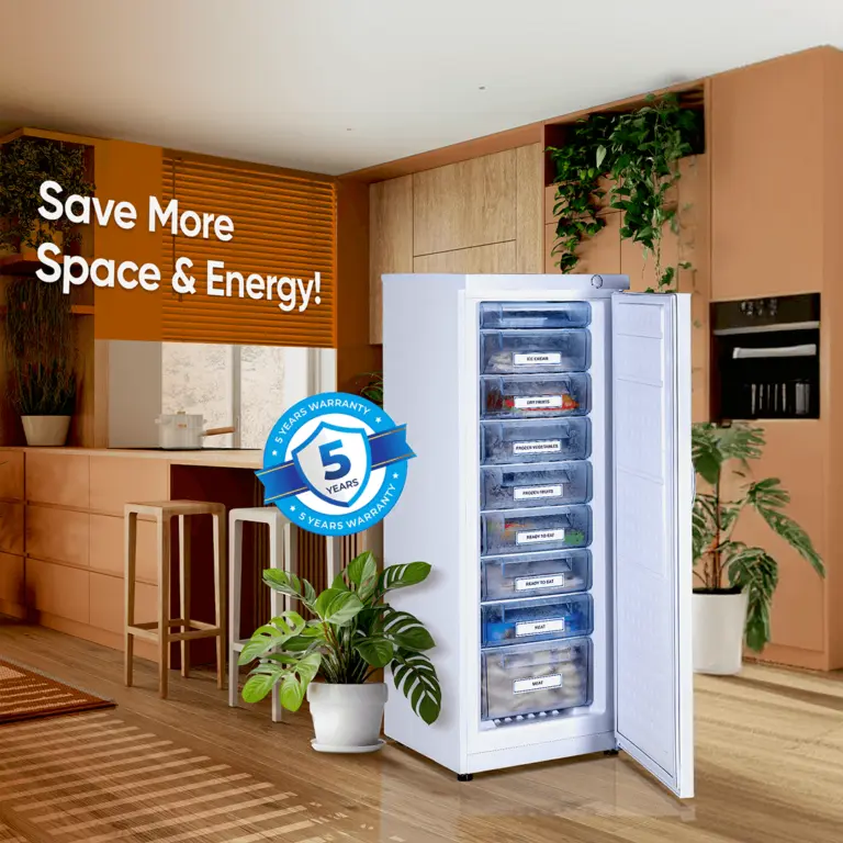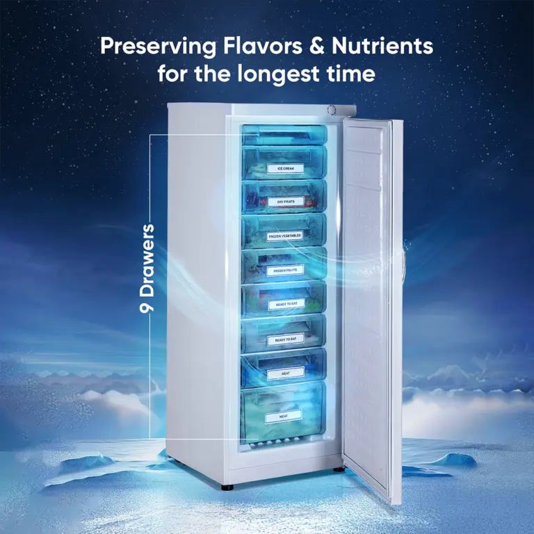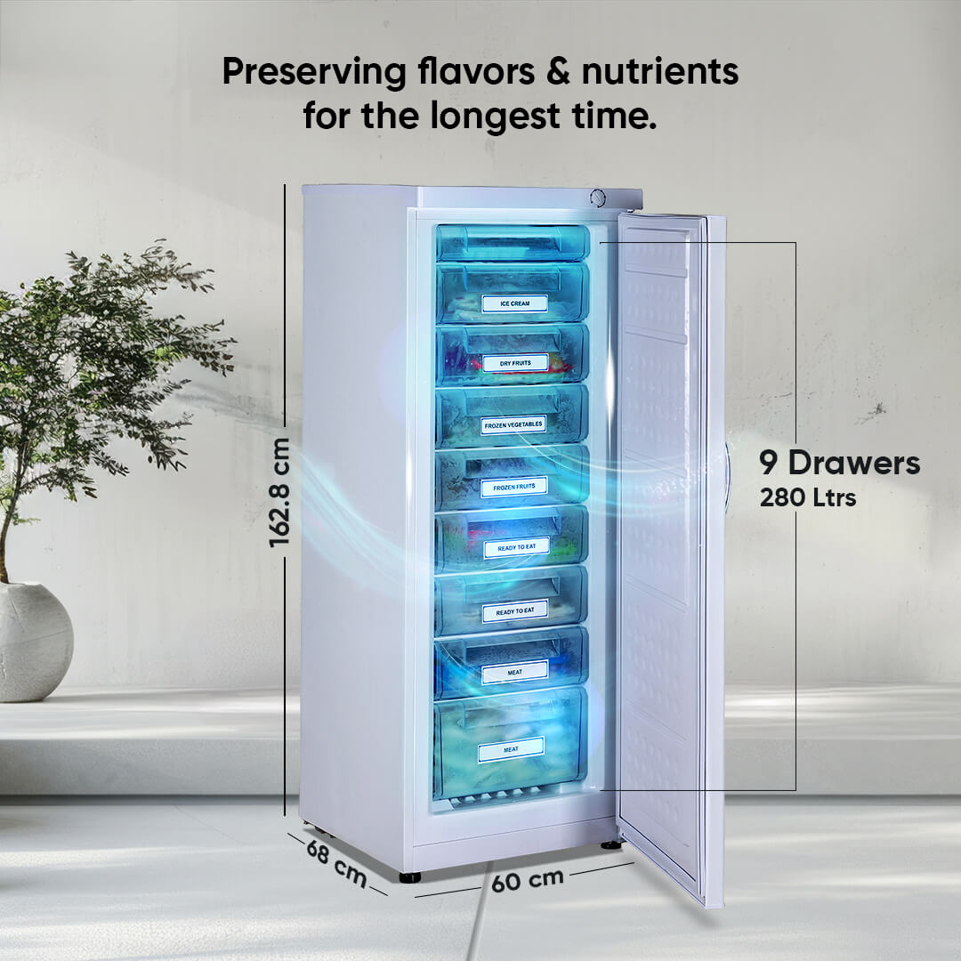 9 Pull-Out Drawers: Rockwell’s Upright Freezer allows for easy segregation and access to frozen items such as frozen vegetables, frozen fruits, dry fruits, ready-to-eat meals, seafood, meat, ice cubes, and ice creams