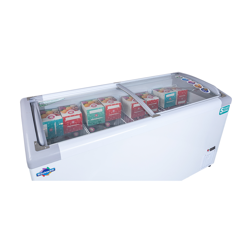 Ample storage: With a huge storage capacity, our inclined glass top freezer offers ample space for frozen foods, ice creams, and more. Adjustable baskets make organization a breeze.